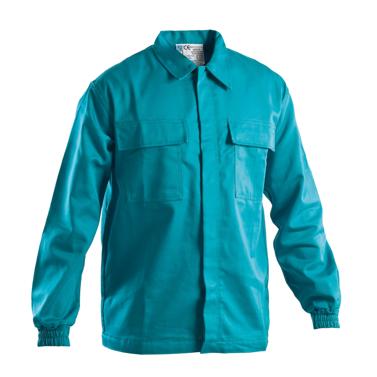 Jachetă ignifugă categoria de siguranță II caracterizată prin guler cămașă, închidere frontală cu nasturi acoperiți automat și manșete elastice. 100% bumbac ignifug.