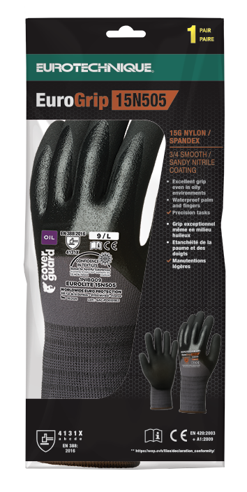 Manusi de protectie EUROLITE, marimea 6, palme imersate in nitril 3/4, antialunecare, COVERGUARD Manusi din nailon-spandex gri Imersate in nitril negru pana la osul pumnului + strat de nitril negru Antiderapant Sandy Usoare, exceptional de confortabile, se muleaza perfect pe mana, cu rezistenta ridicata la uzura si protectie crescuta impotriva sfasierii, capacitate antiderapanta excelenta chiar si in medii umede Tricot fin de 15, manseta elastica cauciucata Gama larga de marimi Standard UE: EN388:2016 4131x