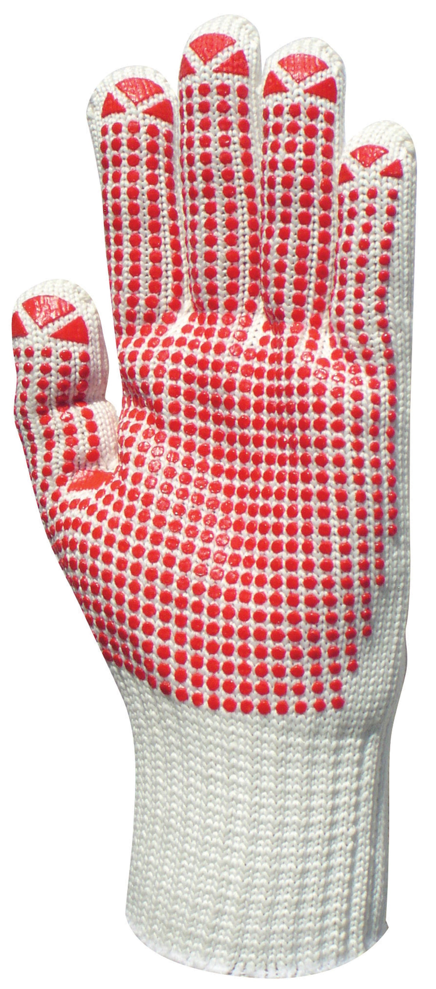 mănuși de protecție groase, rezistente la uzură, pentru solicitări mecanice mari, cu tricot de 7 * interior comfortabil din bumbac, poliamidă în exterior, tricot de 9 fire * buline roșii antiderapante mai mari pe palmă (nu sunt sferice, ci au un cap) . aplatizate)