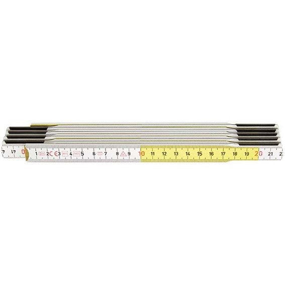 Rigla de pliere din lemn nr. 270-2-10•Lemn de fag, vopsit alternatively în alb și galben•Conexiune ascunsă, unsă cu ulei•Gradații mm negre pe partea superioară și inferioară multii de legătură , zeci roşii•Clasa de precizie EC III