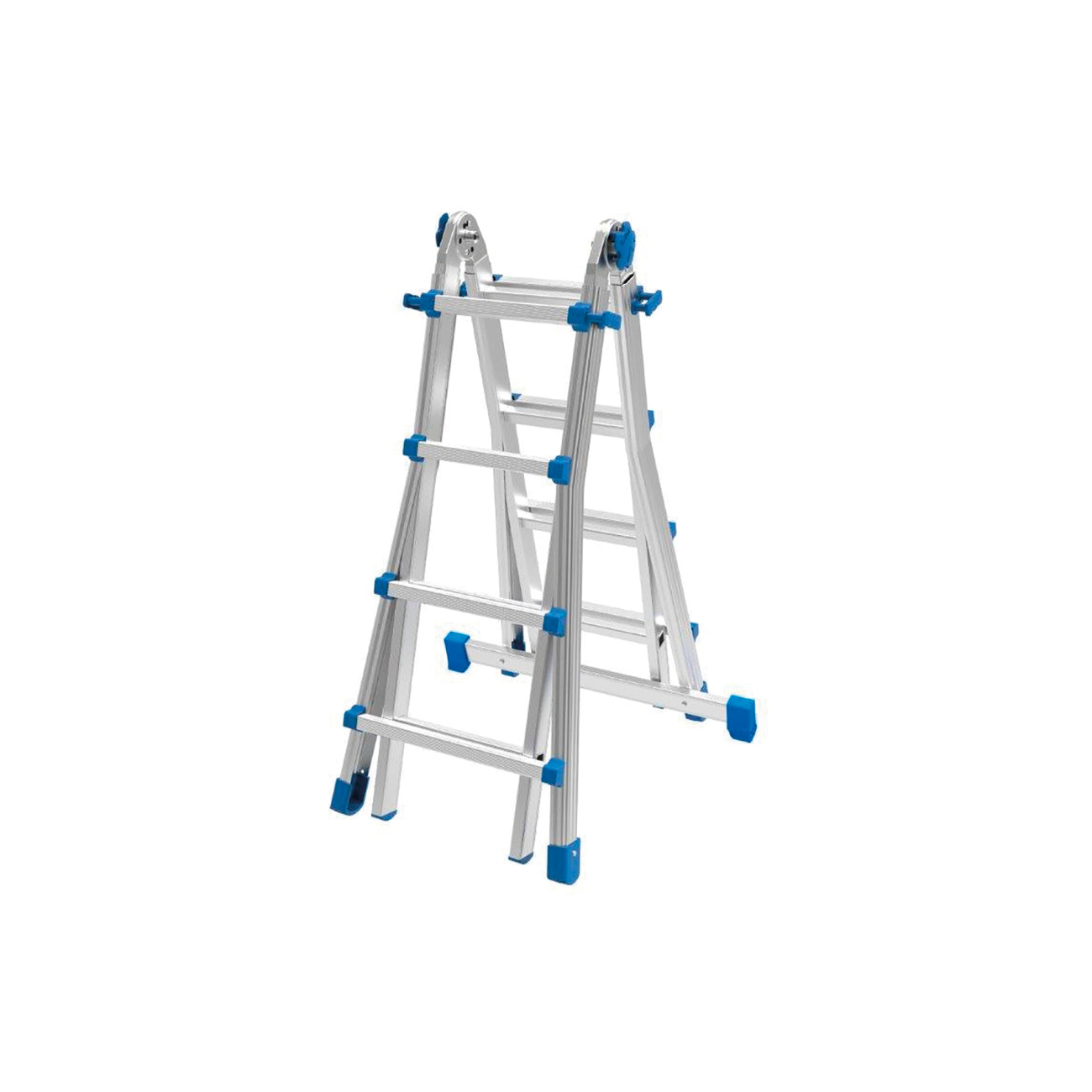 Scări multipoziționale din aluminiu. Scări telescopice extensibile din aluminiu. Poate fi utilizată ca scară extinsă, cu poziție de nivel variabilă și scară dublă. Treaptă zimțată antiderapantă, bază lată cu picioare supradimensionate din PVC pentru aderență maximă la sol. Capacitate 150 kg.