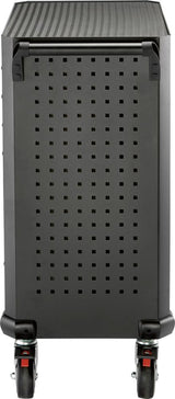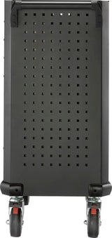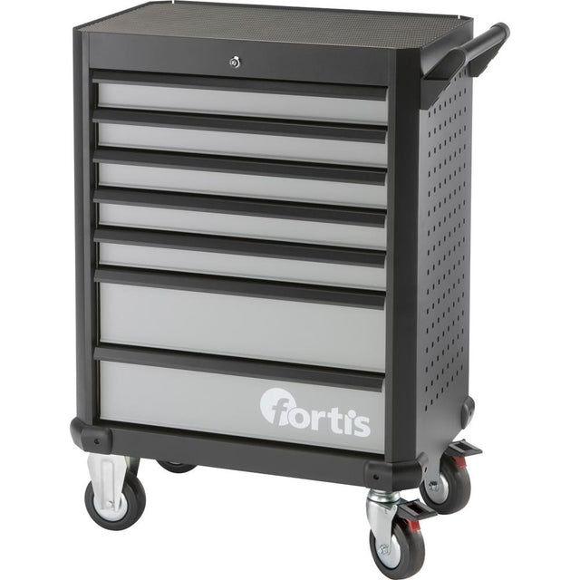 Dulap de scule mobil, 7 sertare, 705x460x1020mm, negru/gri, FORTIS Construcție robustă din tablă de oțel Suprafață acoperită cu pulbere Platformă de lucru cu covor de spumă cu nervuri de 10 mm grosime Cu colțuri de protecție din plastic pe partea inferioară a corpului 2 roți fixe și 2 roți pivotante cu frână Sertarele pot fi scoase pe o parte Extensie completă, cu mecanism de blocare individuală pentru a preveni deschiderea neintenționată în timpul deplasării Sertar cu un covoraș de protecție de 2,5 mm grosime pentru a proteja baza sertarului Șine de ghidare montate pe rulmenți cu bile Ambele capete cu perforație pătrată Închidere centrală cu blocare cu cilindru Livrat cu 2 chei