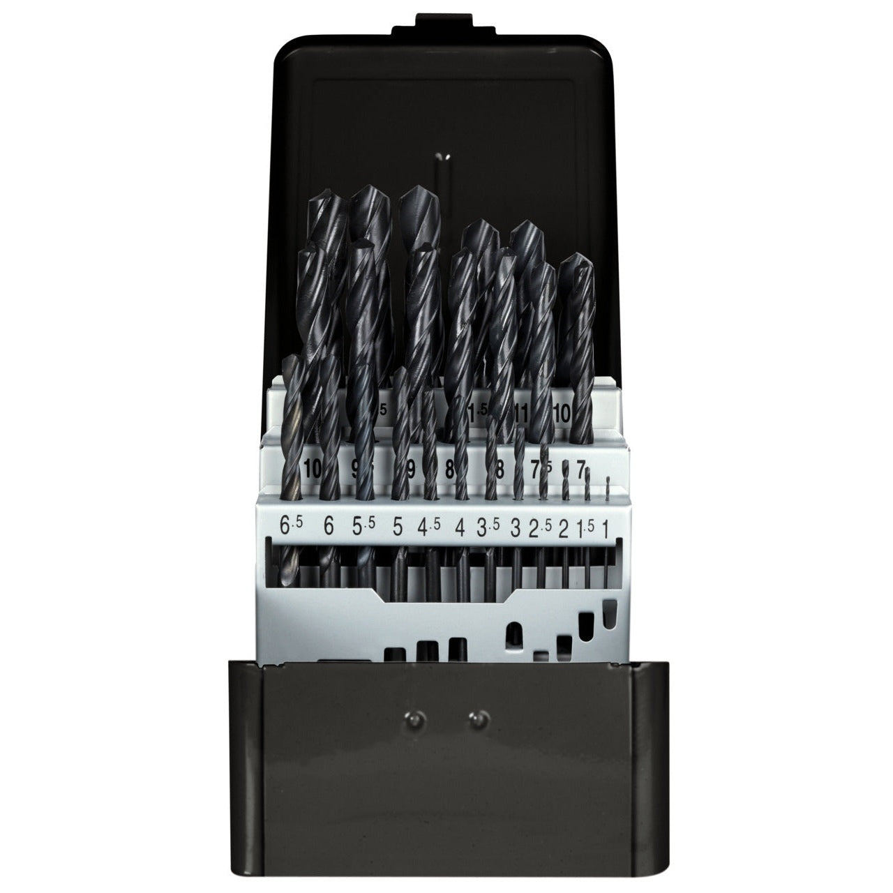 Set burghie HSS, 1 - 13 mm, 25 bucati, R93500025 Burghiu HSS DIN 338, tip N Tăiere pe dreapta Unghiul vârfului: 118° În cutie metalică Continut: 1.0 1.5 2.0 2.5 3.0 3.5 4.0 4.5 5.0 5.5 6.0 6.5 7.0 7.5 8.0 8.5 9.0 9.5 10.0 10.5 11.0 11.5 12.0 12.5 13.0 mm