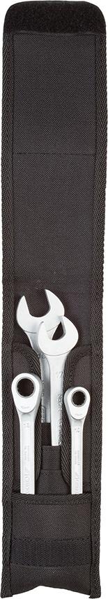 Set chei combinate, cu clichet, nr. S 7 R-04, GEDORE Cromat mat Oțel crom vanadiu 31CrV3 Inserție de blocare și clichet mangan fosfat Capul cu clichet drept Poziția fălcilor înclinată la 15° Unghi de balansare a spatelui 7° până la o dimensiune a cheii de 13 mm și 6° până la o dimensiune a cheii de 19 mm DIN 3113 Livrare: Într-o geantă cu curea.