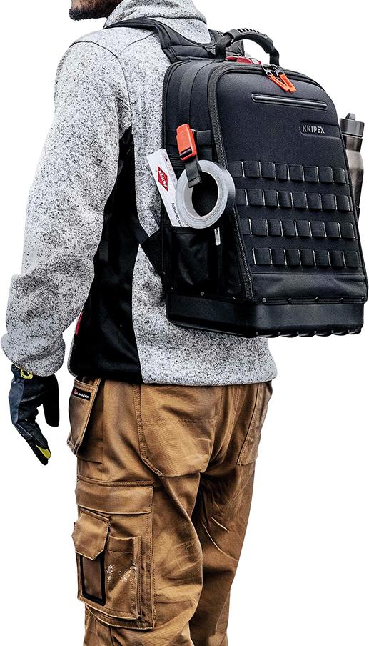 Werkzeugrucksack Nr. 00 21 50 E Modular X18 Elektro•Aus Recycling-Kunstfasern•Aufklappbare Vorder- und Rückseite mit herausnehmbarer Werkzeugtafel•Ergonomische Rückenpolsterung•Optimale Flexibilität durch FIDLOCK®-Adaptern und MOLLE-Bändern•21 Haltelaschen und 37 Taschen, teilweise mit Reißverschlüssen•Bodenschale aus schlagfestem Kunststoff, 60 mm hoch•Kofferlasche zur Fixierung an Teleskopgriffen von WerkzeugkoffernInhalt:1 Automatische Abisolierzange PreciStrip16 190 mm1 Abmantelungswerkzeug ErgoStrip® 135 mm1 Selbsteinstellende Crimpzange für Aderendhülsen 180 mm2 VDE-Schraubendreher Slim für Schlitz-Schrauben 3,5; 5,5 mm2 VDE-Schraubendreher Slim für Kreuzschlitz-Schrauben PZ 1; PZ 21 VDE-Schraubendreher Slim für Kreuzschlitz-Schrauben PZ/S 11 VDE-Spitz-Kombizange 185 mm1 VDE-Flachrundzange mit Schneide (Storchschnabelzange) 200 mm1 VDE-Elektronik-Seitenschneider Electronic Super Knips®1 VDE-Elektro-Installationszange 200 mm1 VDE-Seitenschneider 160 mm1 VDE-Kraft-Seitenschneider 180 mm1 VDE-Kabelmesser 190 mm1 Winkelschraubendreher-Satz, 10-teilig, 1,5-10 mm1 Schlosserhammer 300 g1 Mini-Wasserwaage 68 mm1 Wasserwaage 30 cm1 Kunststoffrohrschneider BiX®1 Schaltschrankschlüssel TwinKey®