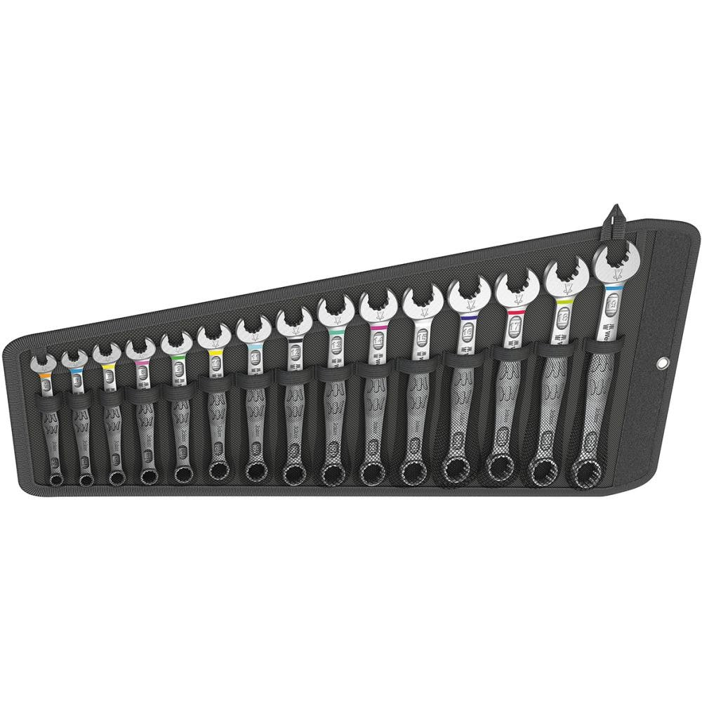 Ring-Maulschlüssel-Satz, Nr. 6003 JOKER 15 Set 1•Doppel-6-kant-Profil•Maulstellung 7,5° abgewinkelt•Ringstellung 15° abgewinkelt•Mit Farbkennzeichnung•Für besonders enge BauräumeLieferung: In Falttasche, für Wera 2go geeignet.