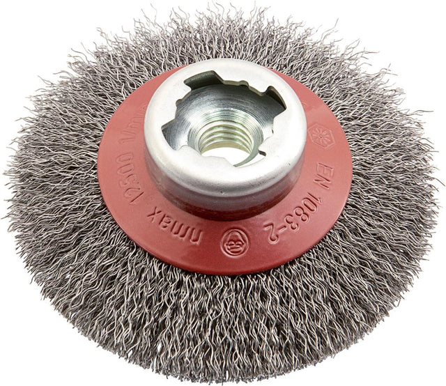 Perie conica X-LOCK, sarma otel ondulata•Sarma otel calit, ondulata •Suport de prindere combinat X-LOCK cu prindere pentru filet M14 •Pentru prelucrare in locuri greu accesibile •Pentru indepartare rugina, vopsea si pentru debavurare
