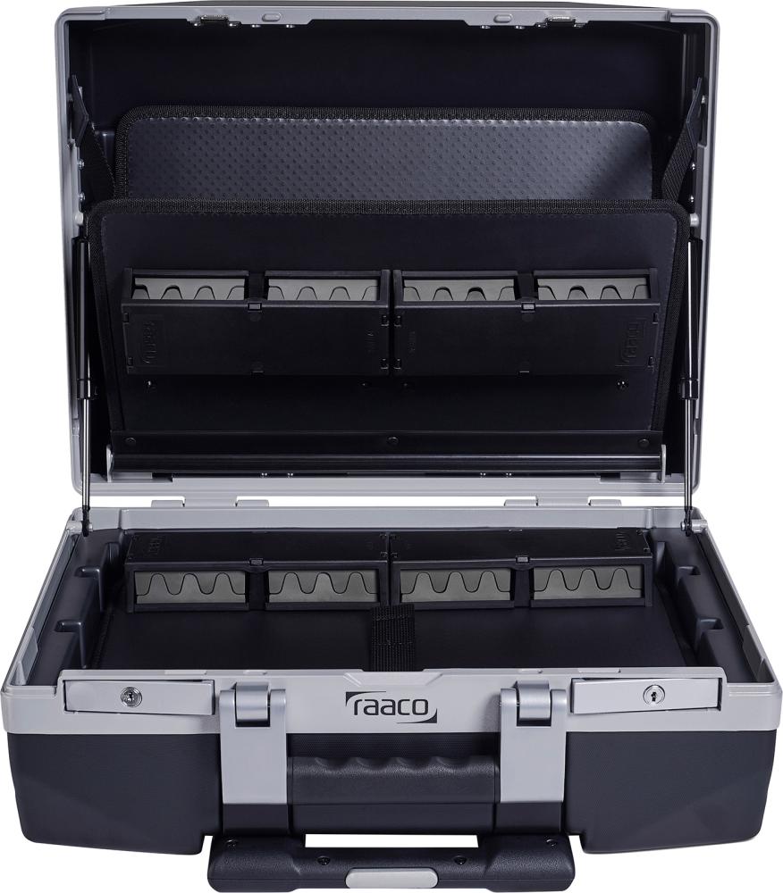 Premium tool case XLT-23/6F•ABS plastic housing•4-fold removable trolley system with spring-loaded rubber wheels, height 105 cm•1 base plate with 2 Open ToolFix tool holders•1 double-sided tool panel with 4 Open ToolFix tool holders•1 single-sided tool panel with 23 pockets and a document compartment•Gas cylinder opening system for easy opening and safe closing of the lid•Robust legs and comfortable carrying handle•Die-cast aluminum frame with additional frame to stabilize the housing< br />Delivery: With 2 cylinder locks.Note: Suitable for checking in as flight luggage.