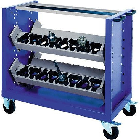 Tool trolley NCThis trolley can carry 32 tool holders. The load capacity is 400 kg. Equipment: •high-quality sheet steel construction with side push handles •4 interchangeable frames with 8 inserts each, the frames are adjustable in height and inclination •1 support tray with rubber mat, ribbed •roller set with 2 fixed and 2 swivel rollers with brake, Ø 100 mm, solid rubber •color: housing in NCS S S4040-R70B B, interchangeable frame NCS S 4502-B