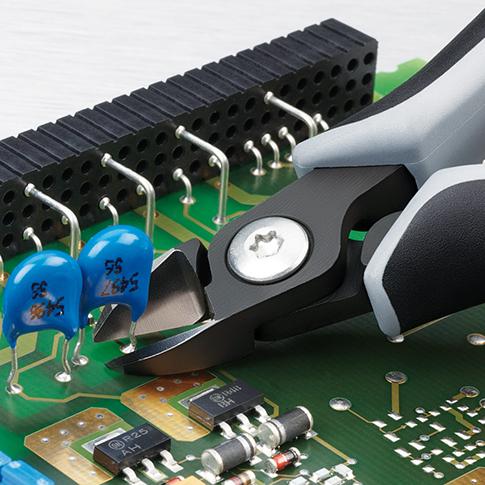 ESD-protected side-cutting pliers, for electronics Super Knips®, 125mm, burnished, wire clamp, KNIPEX Burnished head Handles with two-component protection Special tool steel DIN ISO 9654 Stainless steel rivet joint Opening spring and opening limiter Easy handling for low-effort use No chamfers, with wire clamp Electrostatic energy is slowly and controlledly dissipated For fine cutting work in electronics and fine mechanics
