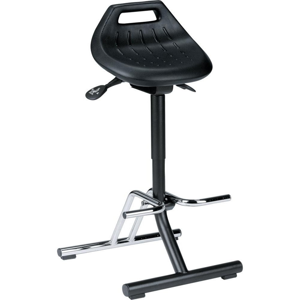 Foam chair with foldable legs, 640-840mm, BIMOS Seat: full foam, black, robust, washable, integrated carrying handle, 360° swivel Seat height adjustment: continuously variable, with gas pressure spring Seat tilt adjustment: forward by 10 Footrest: chrome and foldable