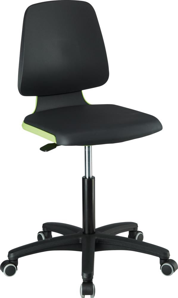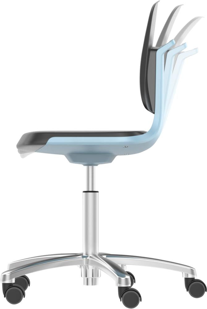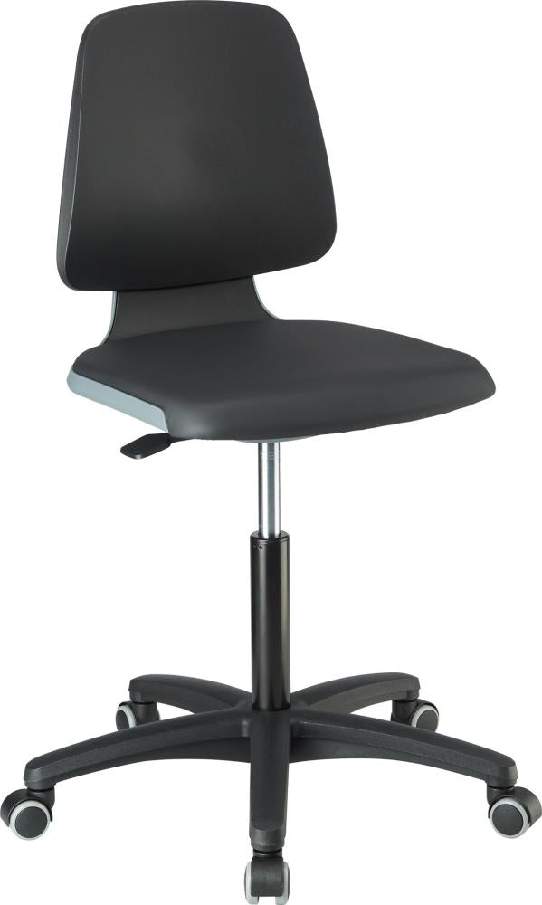 Labsit2 work chair, BIMOS Seat upholstery: black Backrest: plastic, black, with 3D flex function Front edge of the seat: with flex function Plastic base with star, black Wheels do not roll when unloaded, minimal risk of accidents Features: Jointless: for easy cleaning and disinfection Disinfectable and chemical-resistant: resistant to all common disinfectants and chemicals in accordance with ISO 2812 Suitable for clean rooms, for use in clean rooms class 3 in accordance with ISO 146441-1 Suitable for biotechnology laboratories, complies with safety classes S1, S2, S3 of the Biological Substances Ordinance Pollutant-free, free of toxic substances and emissions