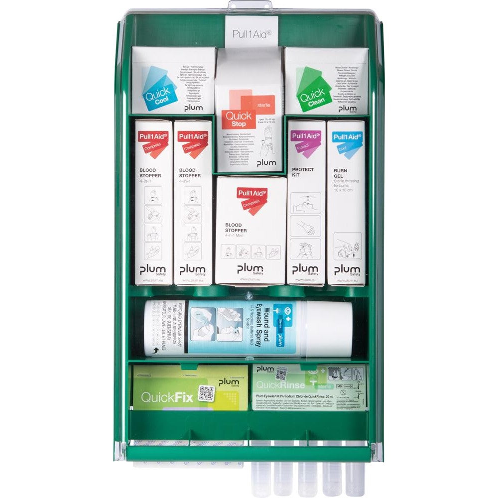 Erste-Hilfe-Station »Pull1 Aid V2«Eigenschaften:•Durchsichtige Abdeckung hygienisch und schütt die Produkte vor Staub•Practische und funktionelle Station•Hochqualitative Produkte•Einfache Verwendung mit klaren Instructions•Einfaches und schnelles Nachfüllen•Sofortiger und sichtbarer Zugang zu den Pflastern, mit einem Ruck einsatzbereit•Wundversorgungsprodukte sind schnell aus den Stationen zu entnehmenInhalt: •1 x Plum Quick Cool•1 x Plum Quick Stop•1 x Plum Quick Clean•2 x Pull 1Aid Blood Stopper•1 x Pull1 Aid Blood Stopper mini•1 x Pull1 Aid Protect Kit•1 x Pull 1 Aid Burn Gel•1 x Wund- und Augenspray•1 x QuickFix Elastic Pflaster•5 Stck. Quick Rinse 20 ml AugenspülampullenHinweis:Lieferung inkl. Anwendungshinweisen und Befestigungsmaterial. Mit separater Piktogrammtafel mit Spiegel
