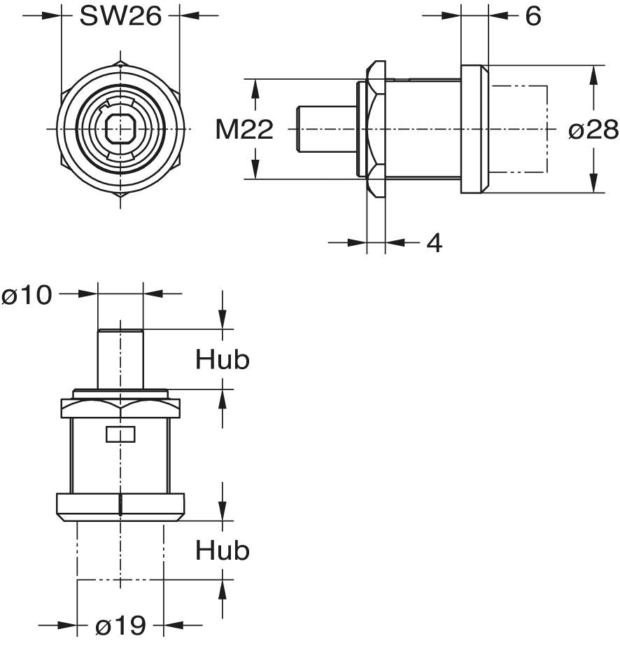 Pressure cylinder no. 8564•Nickel-plated metal•With nut fastening•For material thicknesses up to 16 mm•Closing movement 180°•Stroke 12 mm•Note: Without cylindrical core