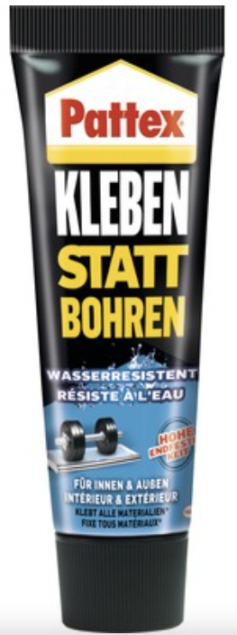 Pattex dispenser adhesive, gluing instead of drilling, 133g, PATTEX® Universal adhesive based on water and plastic dispersions. Not recommended for: PE, PP, PTFE (e.g. Teflon®) natural stone, thin wood, sensitive to swelling (e.g. roller shutter steps) Solvent-free Easy to apply, without bulky tools Quiet, without drilling noise and annoying holes Clean, free of dust and dirt Areas of application: For bonding wood and plaster, concrete, stone and plaster, Styropor® and ceramics, PVC and cork, ABS and many other plastics For indoor and outdoor use Technical data: Processing temperature: at least +10 °C Hazard statements: Warning H229: Pressurized container: May burst if heated EUH208: Contains 1,2-benzisothiazol-3(2H); Preservative: isothiazolinone mixture 3:1 (CIT/MIT). May cause allergic reactions.