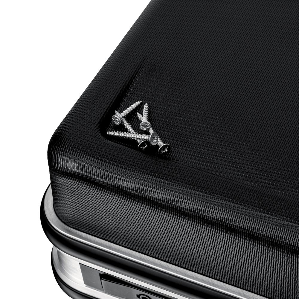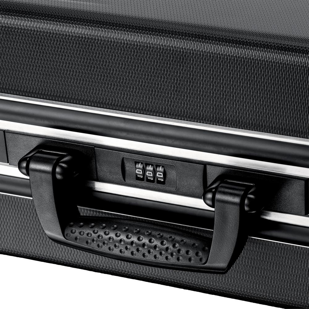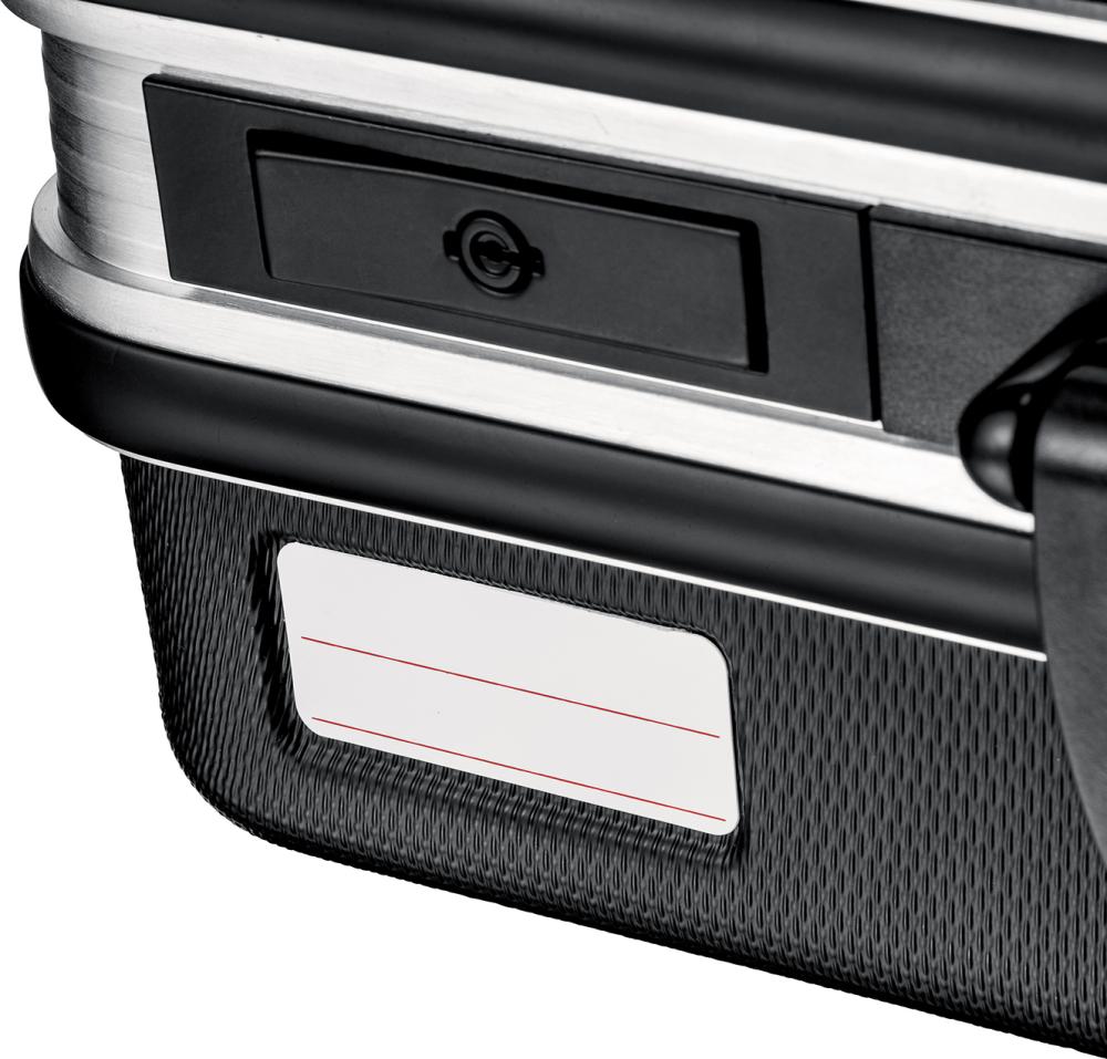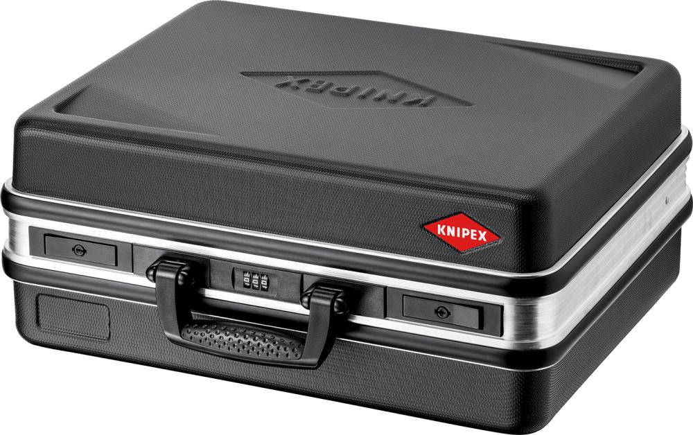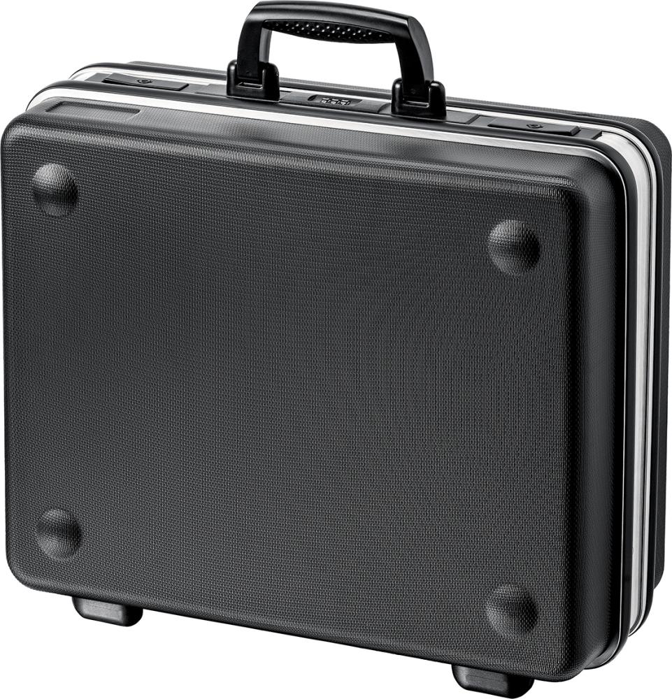 Tool case Basic No. 00 21 05 LE Housing made of ABS plastic, black Aluminium frame Lid holder with hinge mechanism Document compartment in the lid 2 removable tool panels made of dirt-repellent PP with 21 pockets Base tray, 50 mm high, freely divisible and with cover panel with 12 large compartments and 1 flat compartment, can be fixed with a push button Labeling field with 2 stickers for individual labeling Ergonomic carrying handle 2 metal toggle locks and a 3-digit combination lock