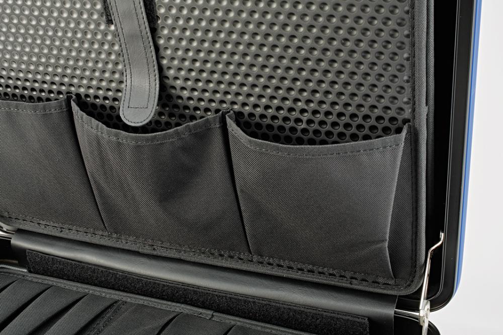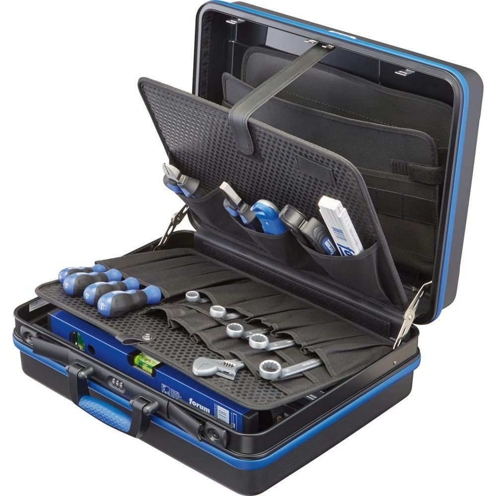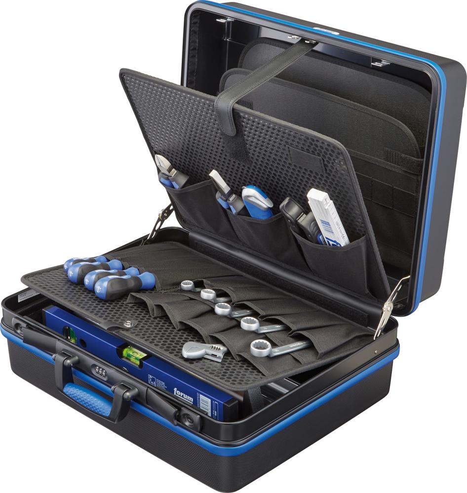 Tool case Impact-resistant ABS plastic Removable panel made of multilayer plastic Tool panel with 22 compartments Closing plate with 15 pockets Document compartment in the lid Individual compartment base with cover Protected hinges and safety systems Ergonomic handle with soft grip area Aluminum frame with edge protection With 2 cylinder locks and combination lock Delivery: With two stable dividers and 8 heads, without contents