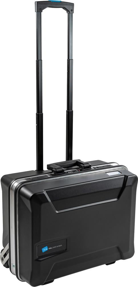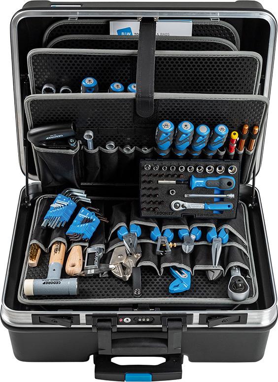 Orca tool case, trolley type HDPE plastic housing with wheels Robust 3-segment telescopic handle Supports for easy opening of the case lid Full-length wheel axle made of solid stainless steel Tool panel with 13 compartments at the front and 10 compartments at the back Cover plate with 15 compartments Document compartment in the lid Individually divisible base tray Covered hinges and safety support for the lid Soft-touch handle Aluminum frame with impact edge protection Locks with 2 tilt cylinder locks and a TSA combination lock