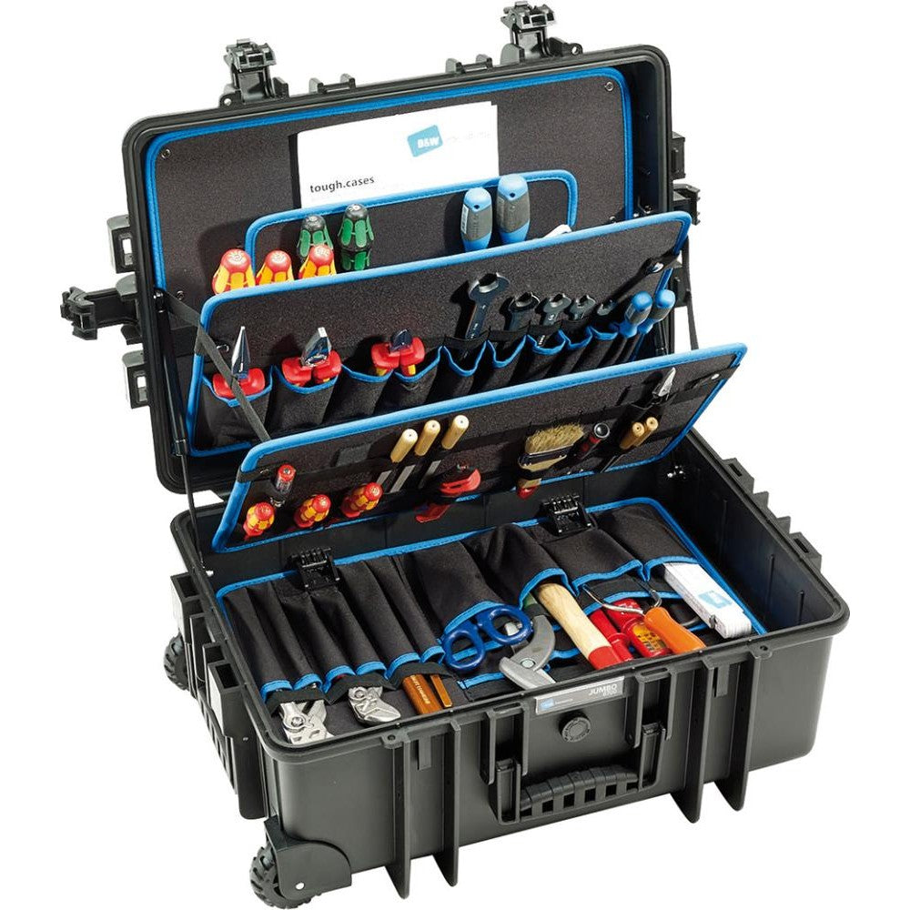 Protective tool case, trolley type Impact and break-resistant polypropylene case body Temperature resistance –30 °C to 80 °C, stackable Dust and watertight Easy transport with 2 inline wheels and telescopic handle Air pressure equalization valve Holes for padlock and owner marking With pneumatic telescope Document compartment in the lid 2 removable panels with compartments in the lid 1 removable panel with compartments Bottom plate with compartmentation possibility 70 cm deep Rubberized handle Possibility of transport by plane Delivery: 3 aluminum dividers, 6 end caps and 4 middle caps, without tools.