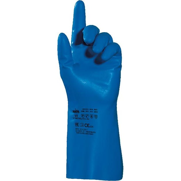 Chemical protection gloves Ultranitril 472 Approval/Standard: EN 388:2016, EN 374:2016, EN 421:2010 Features: Impervious, flexible, nitrile protective gloves Good tactile sensitivity and good dexterity due to the reduced thickness of the material Resistant to oils and fats Chlorinated surface for better protection of the processed product Granulated outside Approved for contact with food Areas of application: food processing, fine assembly and carpentry Material: Nitrile Length: 310 mm Thickness: 0.2 mm Color: blue