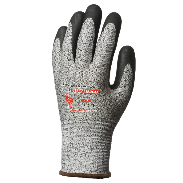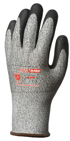 EUROCUT protective gloves, cut resistant, size 6, grey, HPPE, EUROTEHNIQUE Protective gloves made of HPPE (high performance PE) + glass fibers, 13 gauge knit, with maximum tear, wear and puncture resistance, with level 3 cut resistance Protective gloves dipped in black, microspongy nitrile, ventilated in the palm area, with increased life span Lightweight, extra comfortable, perfectly moulds to the hand, with excellent anti-slip properties even in oily environments Elastic rubberized cuff, with ventilation both in the palm and on the back of the palm Wide range of sizes available EU standard: EN 388:2016 4X43B