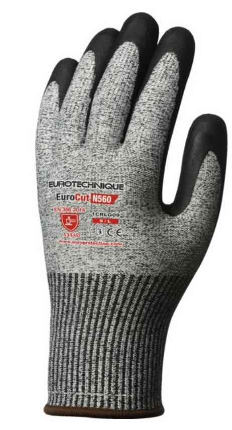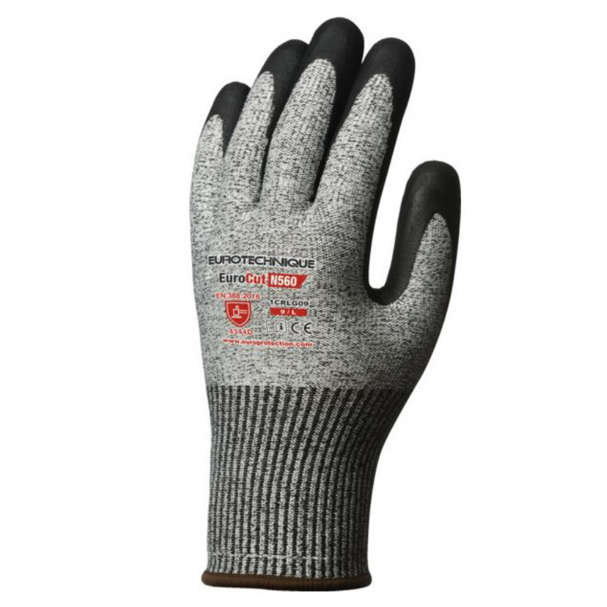 EUROCUT protective gloves, maximum cut resistance level 5/5, size 6, grey/black, HPPE, EUROTEHNIQUE Protective gloves made of HPPE (high performance PE) + glass fibers, 13 gauge knit, with maximum tear and wear resistance, puncture resistance, maximum cut resistance level 5 Protective gloves dipped in black nitrile, microspongy, ventilated in the palm area, with increased life span Lightweight, extra-comfortable, perfectly molds to the hand, with excellent anti-slip properties even in oily environments Elastic rubberized cuff, with ventilation both in the palm and on the back of the palm Wide range of sizes available EU standard: EN 388:2016 4344D