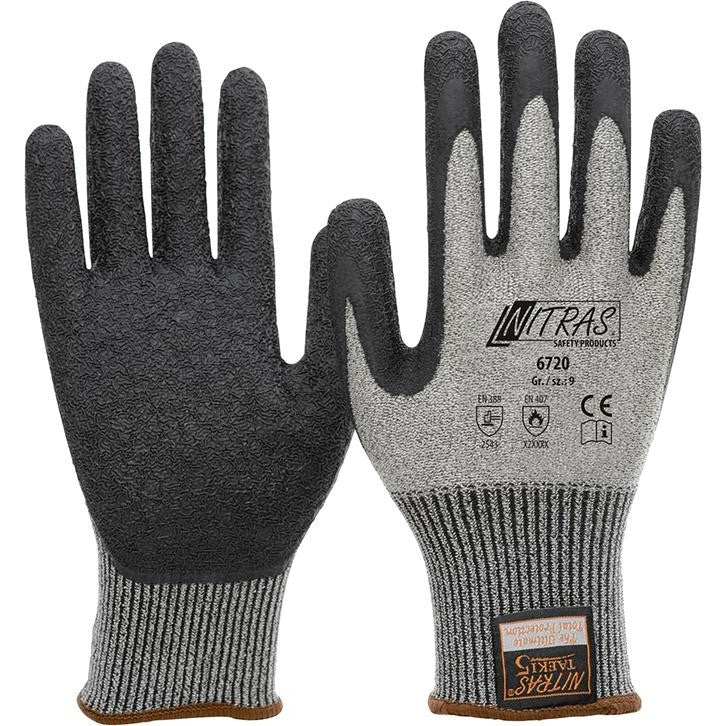 Cut protection gloves, 6720 TAEKI Approval/standard: EN 388, EN 407 Properties: Highest wearing comfort Maximum dexterity Very high cut protection With knitted cuff Sewn with special "TAEKI" thread Material: Partially coated latex on palm and fingertips Color: gray-black