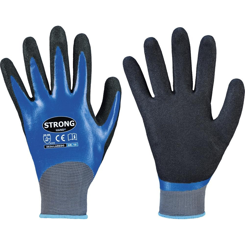 Laredo protective gloves, nitrile Approval/standard: EN 388 Properties: Fine knit, seamless Double protection due to double coating Fully coated Optimal grip even in oily environments Good resistance to oils and greases Excellent abrasion behavior Very good tactile sensitivity Material: Backing 100% polyamide (nylon); First layer: Nitrile, fully coated, smooth; Second layer: Nitrile, sanded palm
