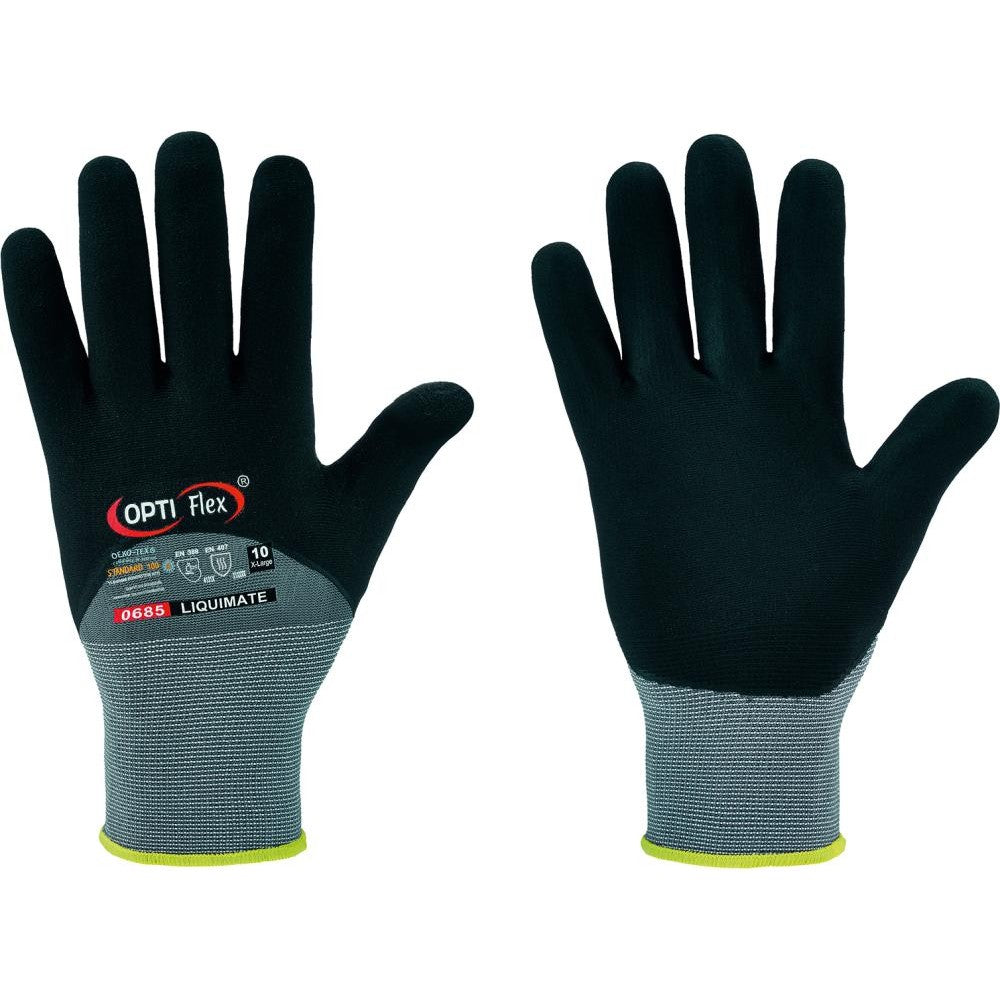 LIQUIMATE® safety gloves Approval/standard: EN 388, certified according to OEKOTEX® Standard 100 Seamless fine knit / 15 G STANDARD 100 by OEKO-TEX®, certificate no. 15.0.69098 Thermal protection: Contact heat level 1 according to EN 407 Elastic lining for perfect fit, flexibility and comfort Breathable nitrile/PU coating Flexible 3/4 coating Thin and therefore light coating, but with good resistance to mechanical stress Very good tactile sensitivity Secure grip even with smooth objects Good resistance to oils and greases Areas of application: Light work of all kinds, assembly, industry, trade, etc. Material: Backing: 92 % polyamide (nylon), 8 % elastane, Coating: Nitrile foam with water-based polyurethane Gauge: 15 Colour: grey-black