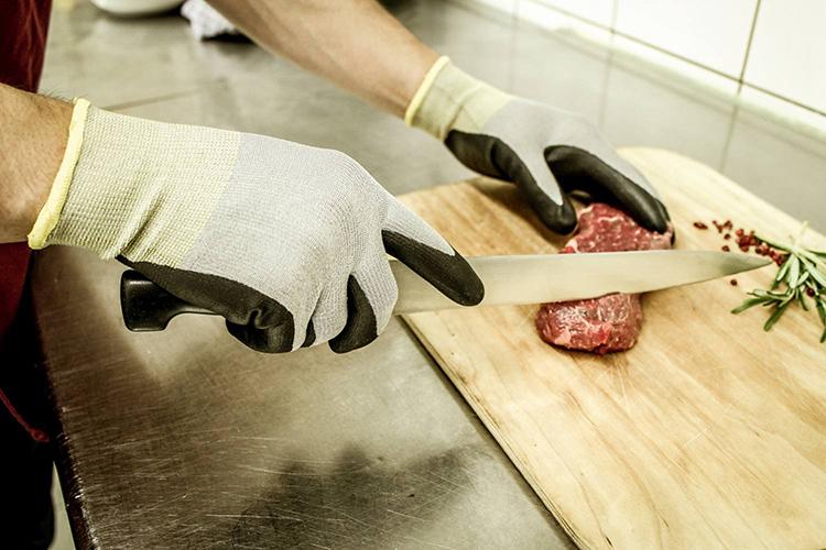 SkinClean 8720 protective gloves Approval/standard: EN 388 Features: Perfect wearing comfort Free of harmful substances Knitted waist Abrasion-resistant High mechanical resistance Partially coated on palm and fingertips OEKO-Tex Standard 100 Areas of application: For contact with food Material: Special elastic knit, partial coating of polyurethane prepolymer Gauge: 15 Color: gray-black