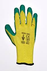 Manusi de protectie tricotate din bumbac imersate in latex in palma si pe degete, dos aerisit, folosite in special pentru manipularea obiectelor alunecoase.  EN 388(2243), EN 420