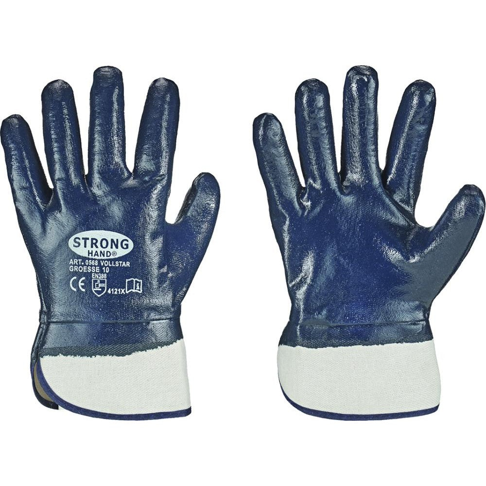 VOLLSTAR protective gloves Approval/standard: EN 388, EN 420 Properties: Robust and flexible Repellent to fats and oils Design: 2-fold dipped Fully covered back of the hand Cloth cuff Areas of application: Handling slippery materials Material: 100% cotton backing, nitrile coating Color: blue
