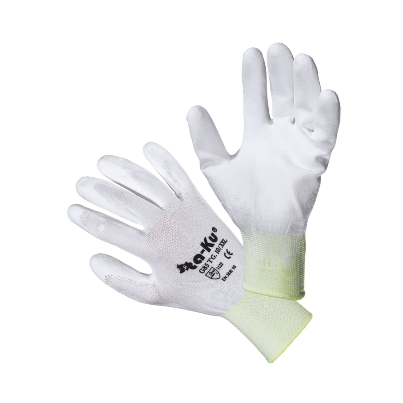 Polyurethane coated nylon work gloves. High performance, white. With ventilated back and elastic knit wrist. Excellent mechanical resistance to abrasion and tearing. Recommended for precision work.
