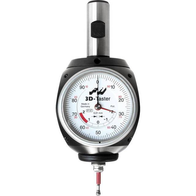 3D analog probe, IP67 IP 67 protection Tool-free probe rod change and no recalibration Random approach direction (X, Y, Z axis) Safety through increased traverse, predetermined break point at the probe end For fixing zero points on workpieces and measuring lengths on milling and EDM machines as well as for centering and positioning holes and axes. Delivery: With probe rod Ø 4 mm.