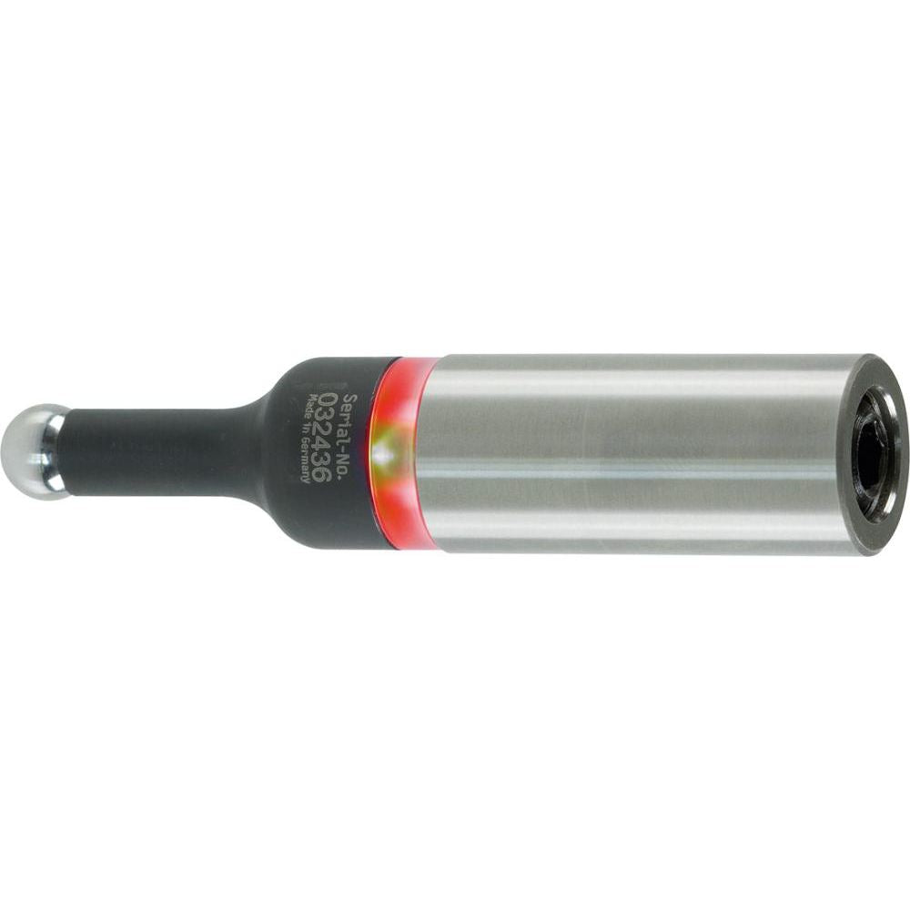Edge finder with illuminated display Hardened and precision ground Red LED display Taking into account the semicircle of the feeler ball, the zero line is reached Spring-loaded ball retracts when passing over the edge of the workpiece to avoid damage to the feeler Preferably used with stationary spindle For measuring on drilling and milling machines, machining centers, external and internal centering Edge finder with illuminated display Display lights up when touching the edge of the workpiece Delivery: In plastic case, including batteries.