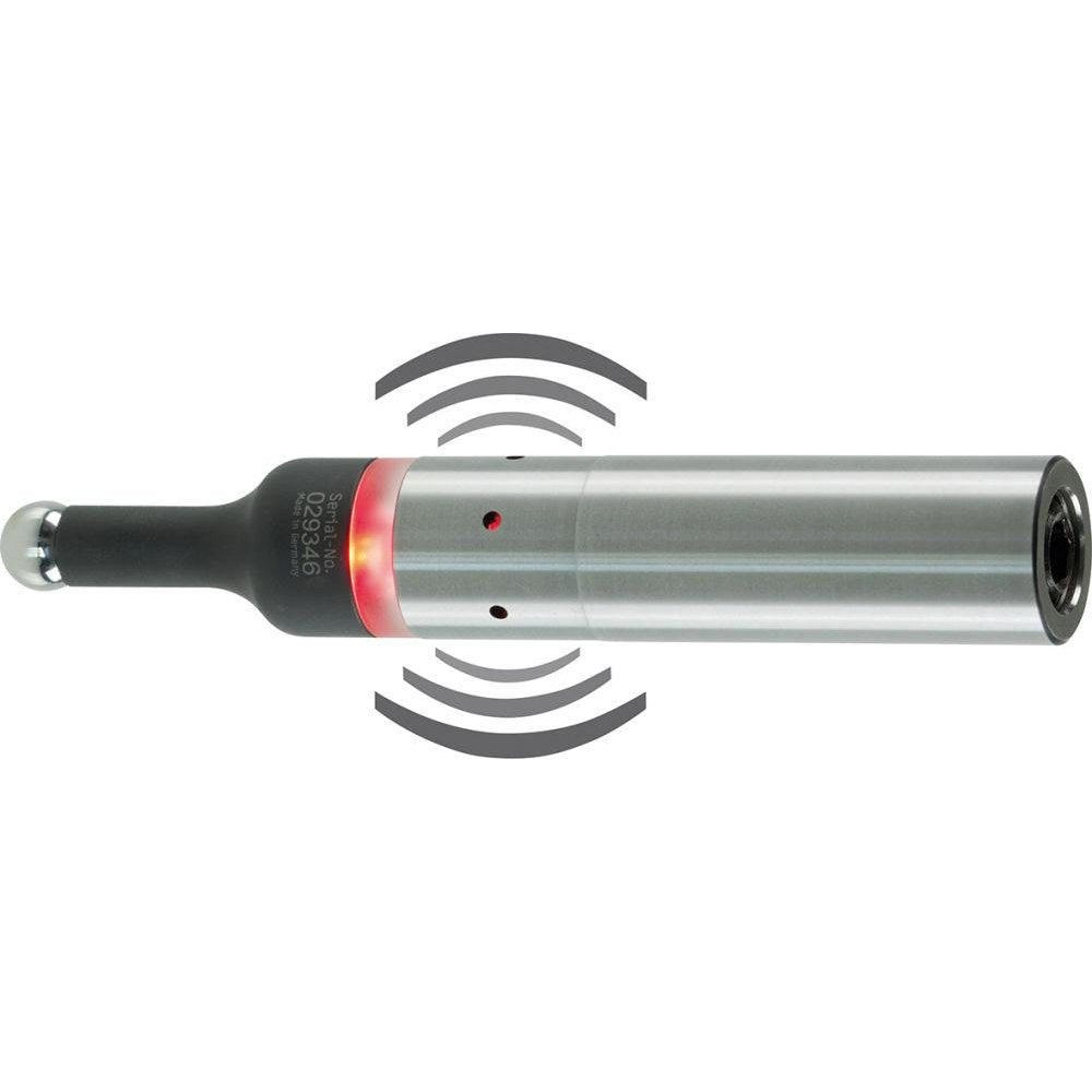 Edge finder with light display and acoustic signal Hardened and precision ground Bright red LED display When passing over the edge of the workpiece, the spring-supported ball retracts to avoid damage to the finder Preferably used with a stationary spindle For measuring on drilling and milling machines, machining centers, external and internal centering When touching the edge of the workpiece, a light signal and an acoustic signal are triggered Delivery: In plastic case, including batteries.