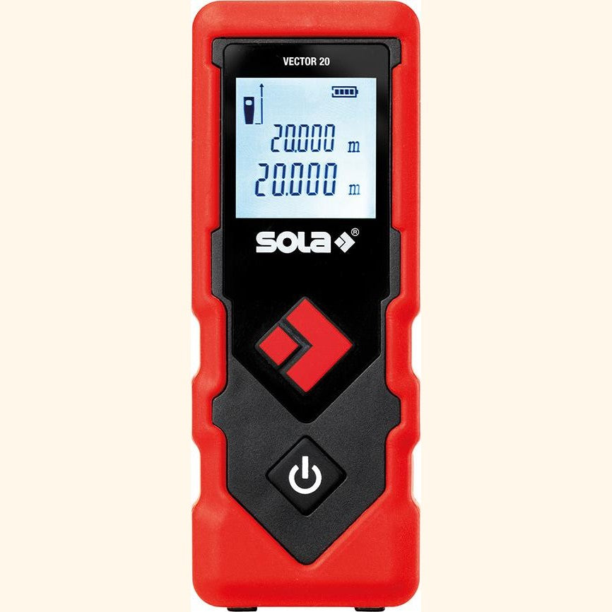Vector 20 laser rangefinder The SOLA VECTOR 20 model rangefinder measures distances extremely quickly and easily Illuminated display for optimal visibility Autonomy of up to 5,000 measurements Small and handy, soft-grip bi-material housing for optimal grip in the hand Continuous measurement function For indoor and outdoor use.