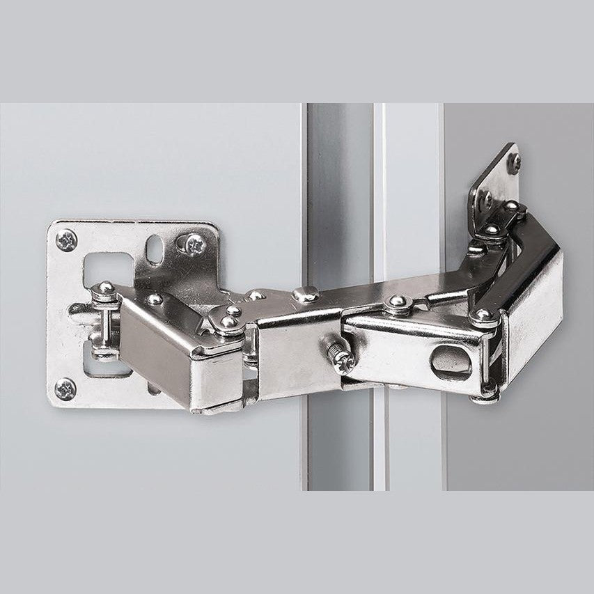 Spring-loaded screw-in hinge, 165-130° recessed doors•Opening angle 165°•Opening angle can be infinitely reduced to 130° using an adjusting screw•Steel, nickel-plated