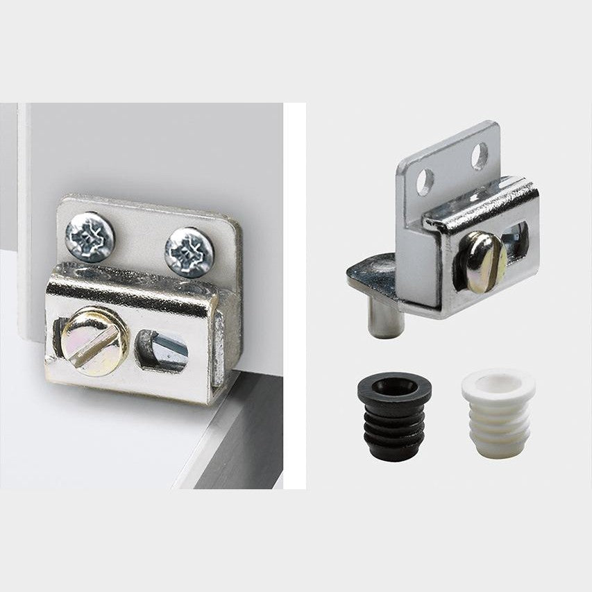 Pivot hinge, 110° For single-action swing doors Opening angle of 140° Easy installation and simple lateral adjustment of the doors For door thicknesses of 16 - 20 mm Door height = clear height of the casing - 5 mm Including plastic bearing in the colours white and black Nickel-plated steel, untreated zinc, white / black plastic