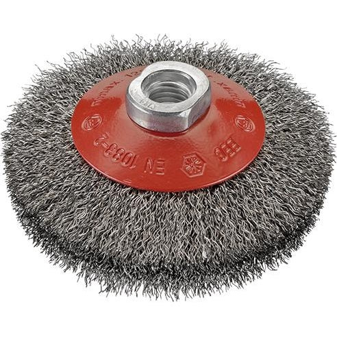 Conical wire brush, steel, 0.3 corrugated wire, 100x10mm, M14 fitting, FORUM - Conical wire brush, steel, 0.3 corrugated wire, 100x10mm, M14 fitting, FORUM is backordered and will ship as soon as it is back in stock.