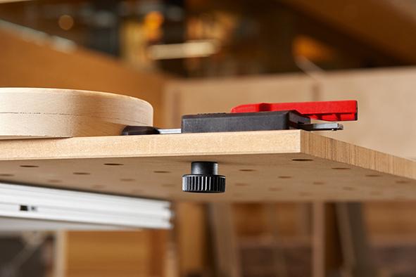 Horizontal clamp set MFT, for multi-function tables, WNS-SET-MFT Quick clamping thanks to the laterally positioned clamping lever Allows the entire surface of the workpiece to be processed, including round and flat workpieces The patented pull-down mechanism prevents the workpiece from lifting off the table surface when clamping on the table surface, even without a clamping screw The bench hook can also be used as a universal stop for workpieces For use on multi-function tables such as Festool MFT and Sortimo WorkMo, with a hole diameter of 20 mm and a plate thickness of min. 19 mm Clamping force up to 750 N Contents: 2 horizontal pull-down clamps 2 bench hooks 4 serrated nuts
