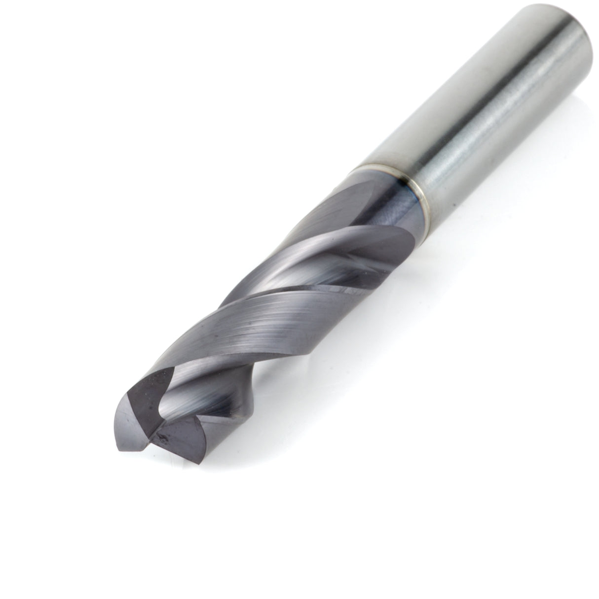 Burghie din carbură solidă cu tijă ranforsată KERFOLG HD 3XD cu tratament de suprafață devil și helix avansat, subțiere a miezului, ascuțire autocentrantă și geometrie concavă a muchiei de tăiere.