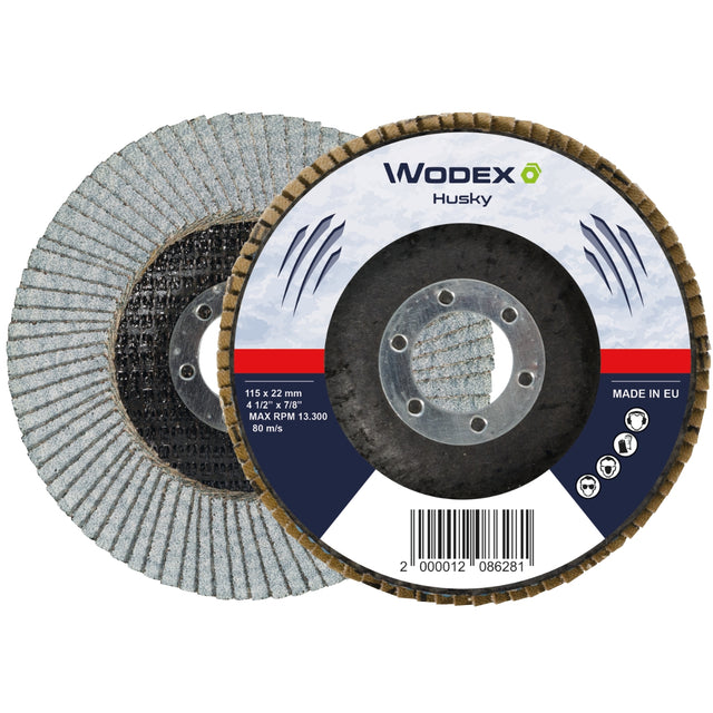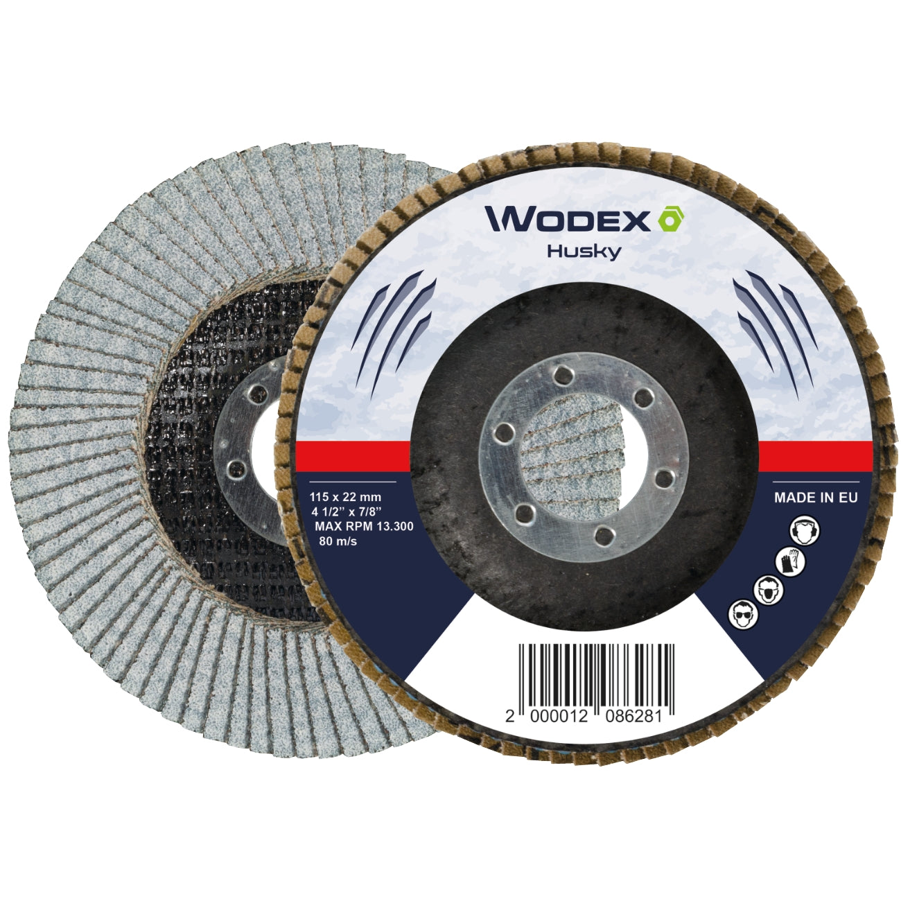Discuri cu clapetă cu suport din fibre și pânză din stearat de zirconiu WODEX HUSKY. Stearatul permite lucrul la rece și reducerea înfundării discului.