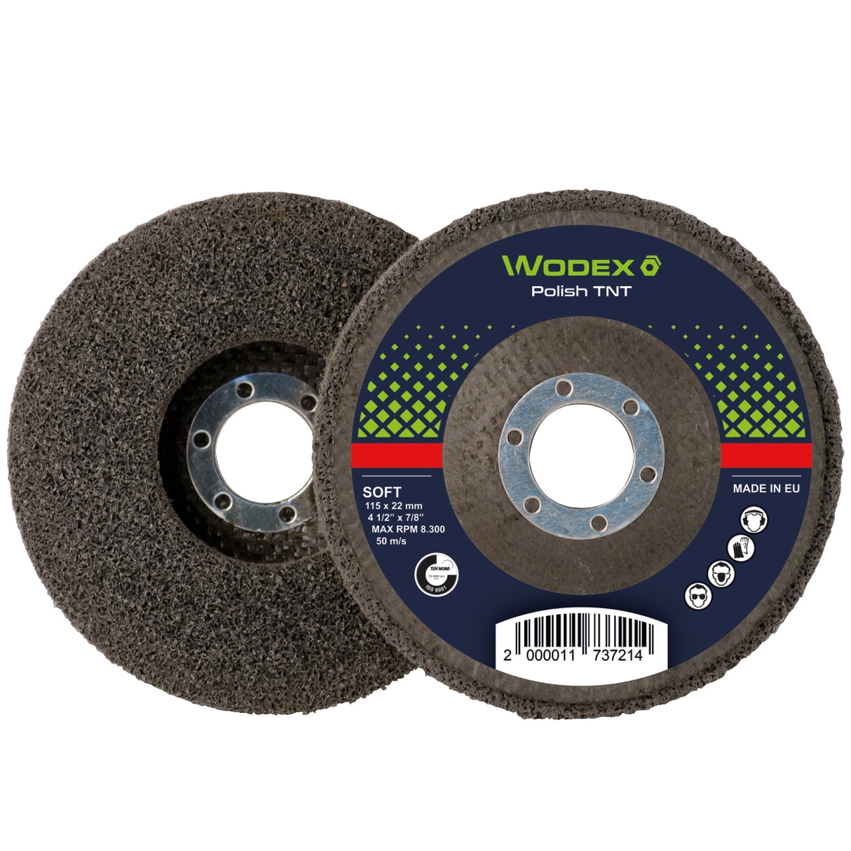Discuri pentru tratarea suprafețelor WODEX POLISH TNT, țesătură nețesută impregnată cu granule abrazive pe o placă suport din fibră de sticlă. Plasa strânsă permite îndepărtarea imperfecțiunilor minore lăsate de discurile cu clapetă.
