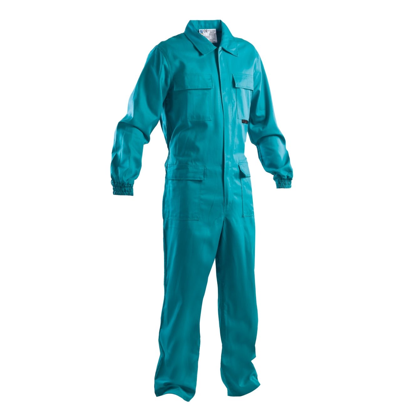 Salopetă ignifugă categoria II de siguranță caracterizată prin guler cămașă închis, închidere frontală cu fermoar acoperit, manșete elastice, talie elastică spate, două buzunare pe piept cu clapetă Velcro. 100% bumbac ignifug.