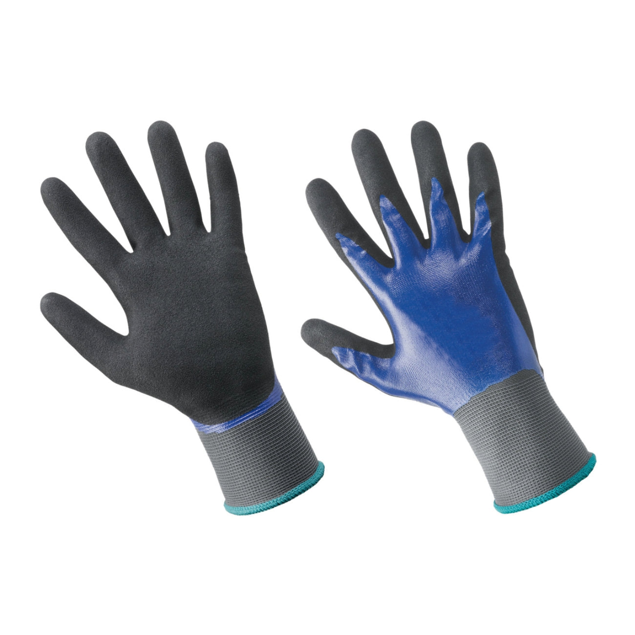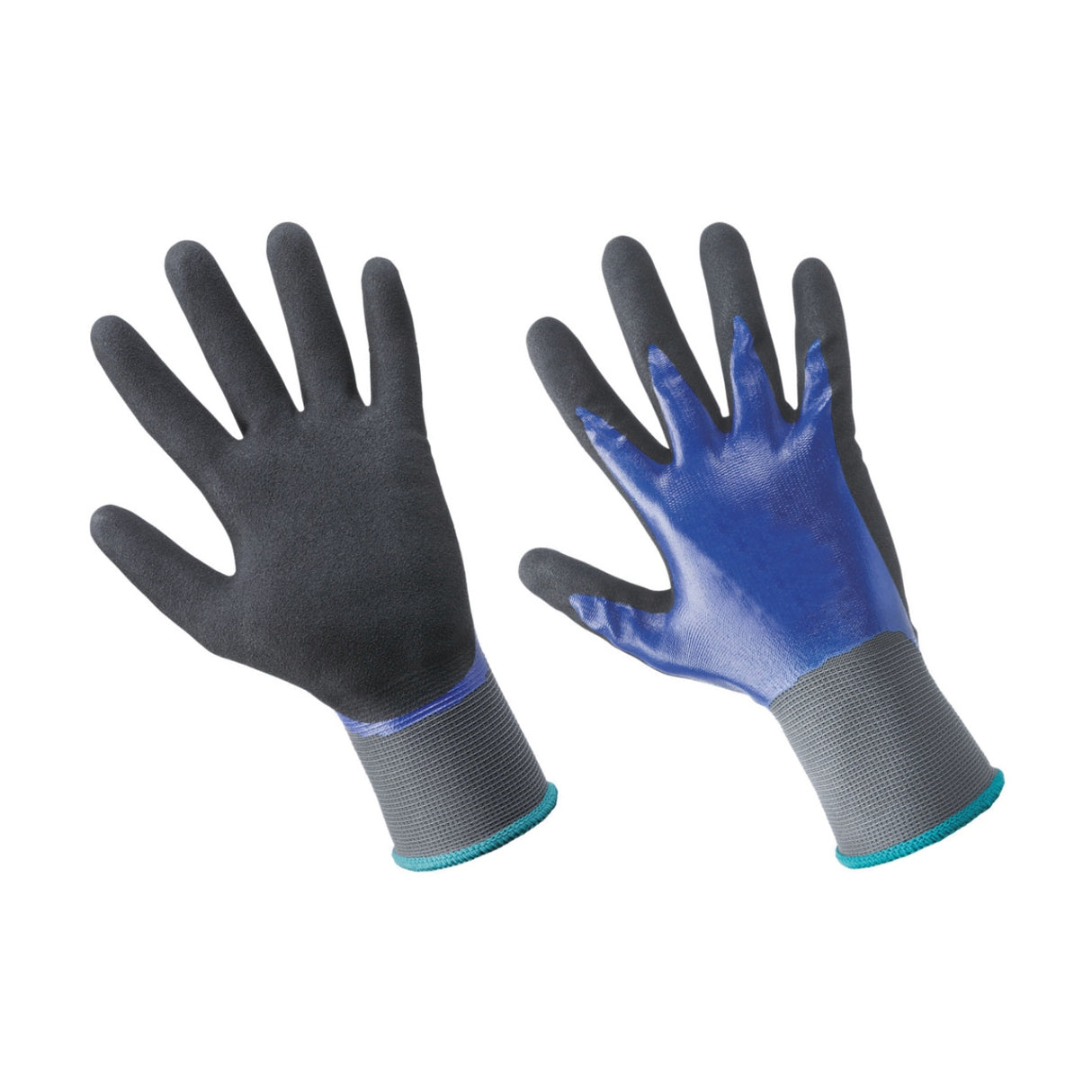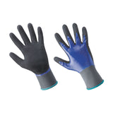 Mănuși de lucru din nailon acoperite cu nitril microporos. Rezistență excelentă la abraziune, aderență superioară în cazul uleiului și grăsimii. Culoare albastru/negru.