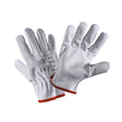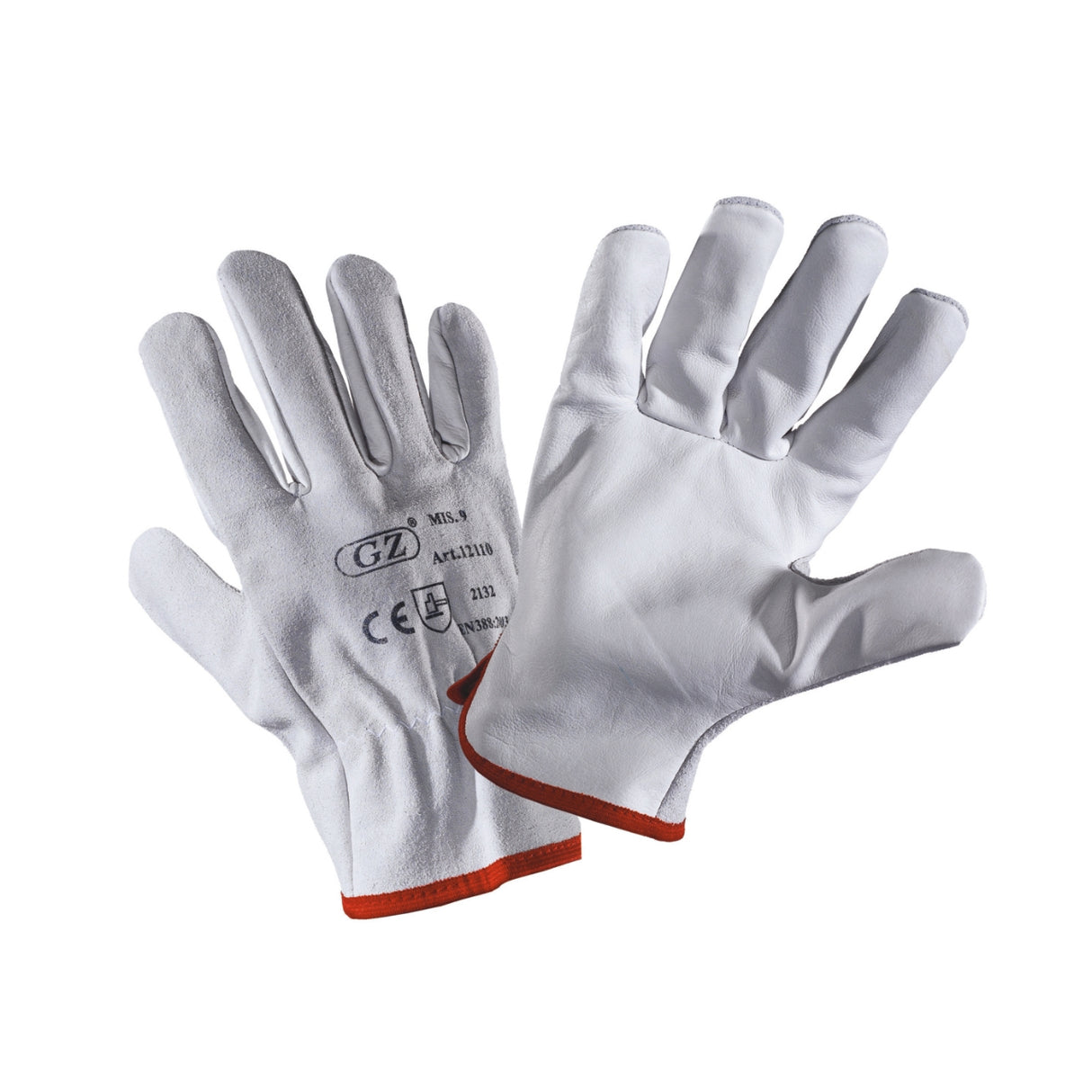 Mănuși de lucru din crustă de piele de vită înflorată cu tiv, înveliș interior elastic pentru încheietura mâinii. Rezistente la abraziune și rezistență excelentă la perforare, disponibile în diferite mărimi, culoare alb.