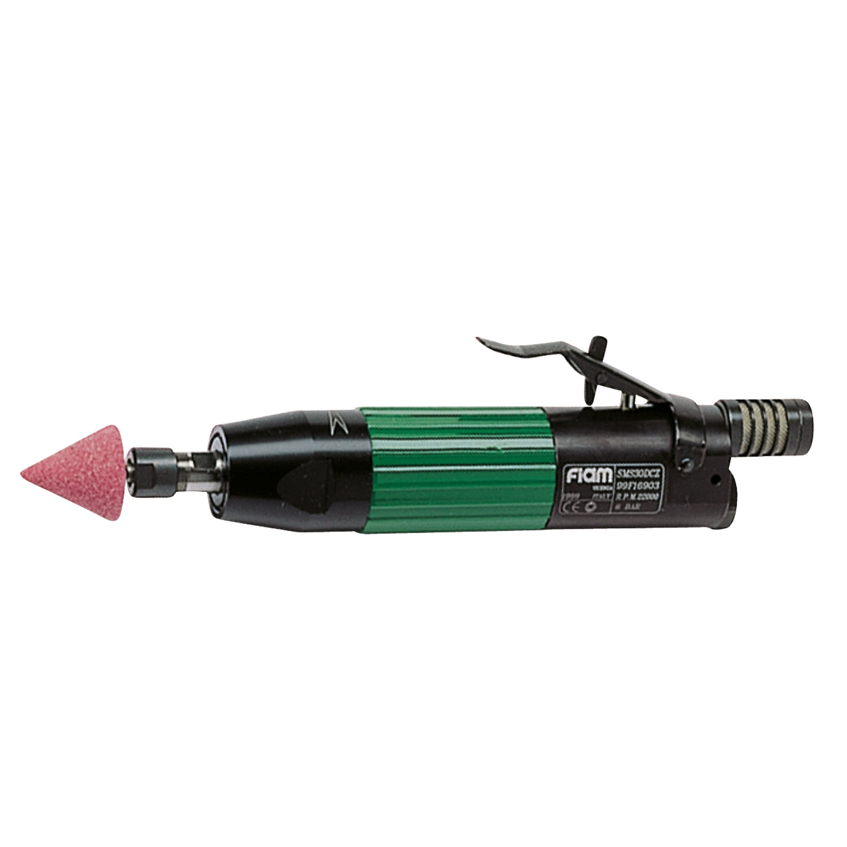Polizor pneumatic compact și ușor de manevrat FIAM SMS30DC, potrivit pentru debavurarea, netezirea și lustruirea matrițelor, utilizabil cu roți cu tijă, fișiere rotative, perii metalice și role cu clapetă, cu un diametru maxim de 30 mm.