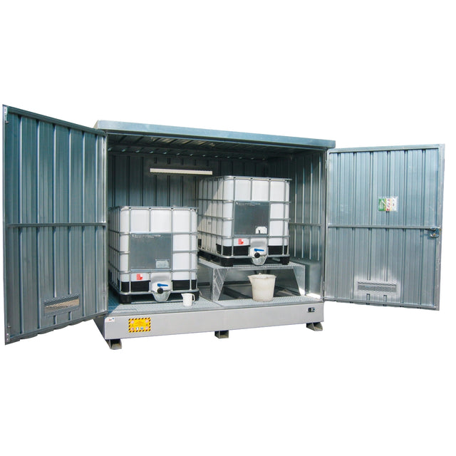 Container de depozitare pentru două rezervoare de 1000 litri cu un rezervor de colectare din oțel care a fost vopsit manual cu o vopsea epoxidică bicomponentă și finisat cu vopsea acrilică de înaltă soliditate, culoarea RAL 9006.