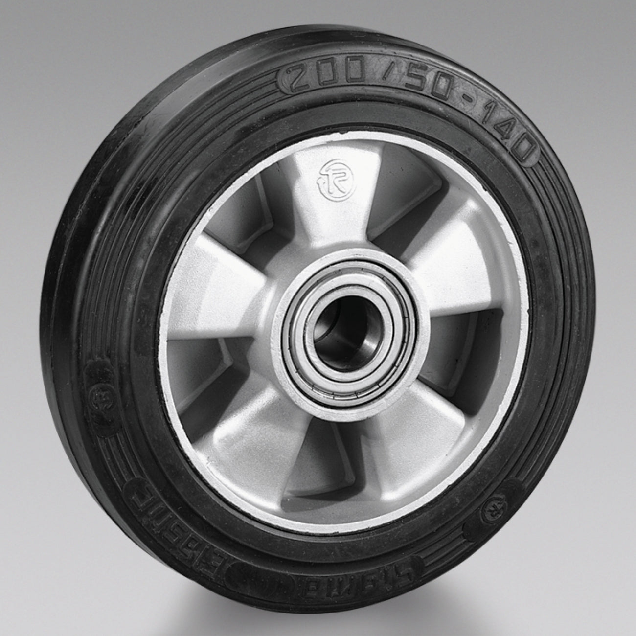 Roți din cauciuc cu centru din aluminiu TELLURE RÔTA SIGMA ELASTIC. Potrivit pentru utilizare în medii umede și în prezența substanțelor chimice cu agresivitate medie.